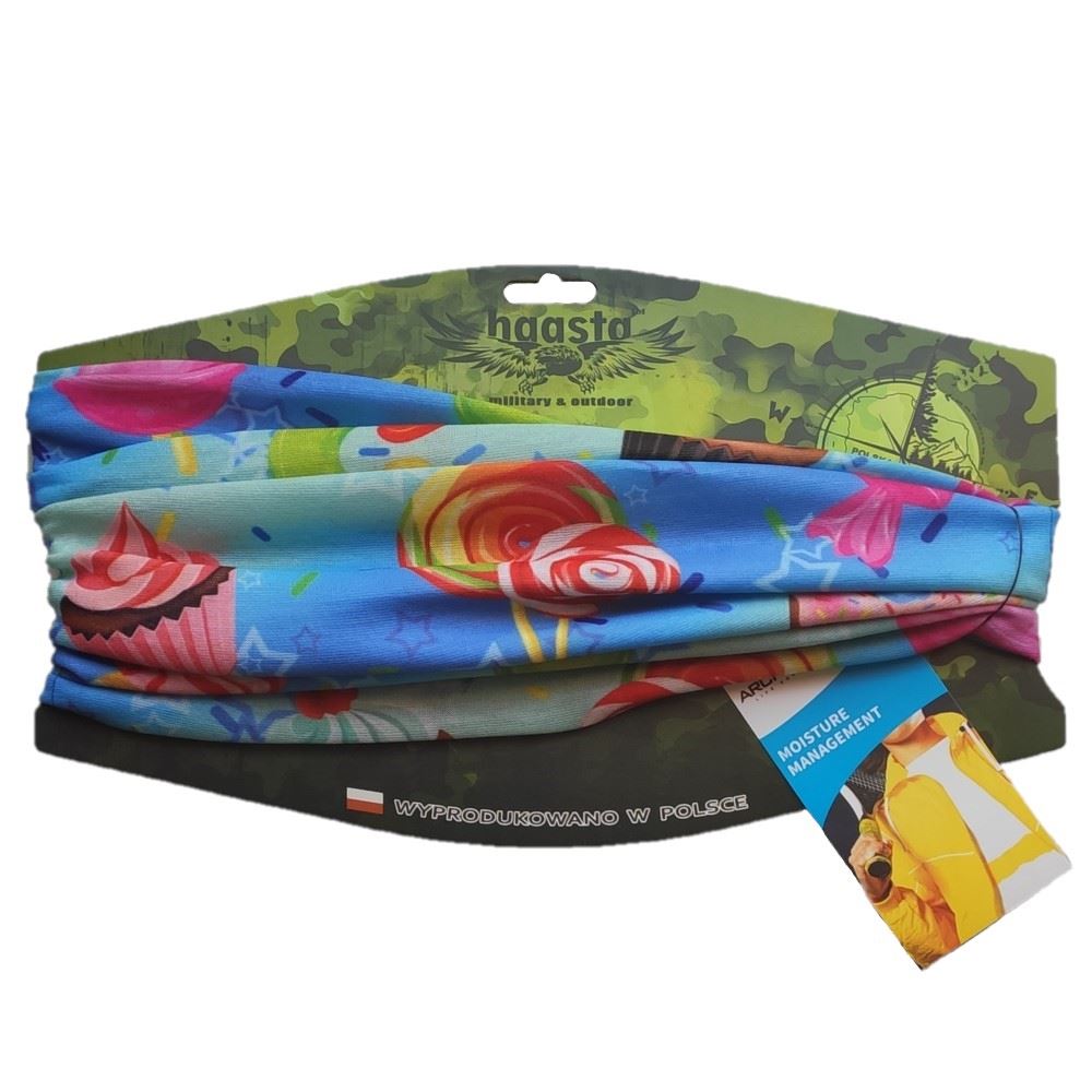 Nasza chusta wielofunkcyjna wzór Słodycze jest zarówno ciekawym pomysłem na urozmaicenie stroju oraz modnym dodatkiem. Chusta wielofunkcyjna Haasta to wszechstronny produkt. Chusta jest doskonała do stosowana na wiele sposobów w użytku codziennym. W bardzo łatwy sposób z chusty można zrobić czapkę, maskę, opaskę czy kominiarkę. Może służyć także jako szalik czy ozdobna apaszka lub jako maseczka ochronna na twarz.
