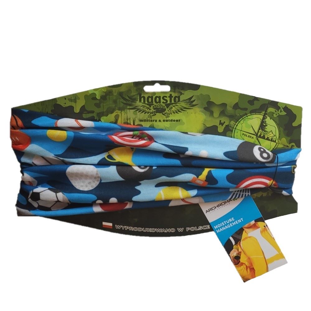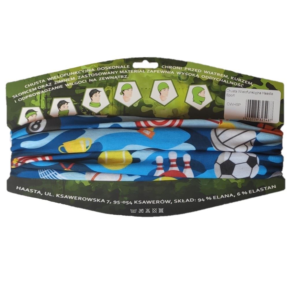 Nasza chusta wielofunkcyjna wzór Sport jest zarówno ciekawym pomysłem na urozmaicenie stroju oraz modnym dodatkiem. Chusta wielofunkcyjna Haasta to wszechstronny produkt. Chusta jest doskonała do stosowana na wiele sposobów w użytku codziennym. W bardzo łatwy sposób z chusty można zrobić czapkę, maskę, opaskę czy kominiarkę. Może służyć także jako szalik czy ozdobna apaszka lub jako maseczka ochronna na twarz.