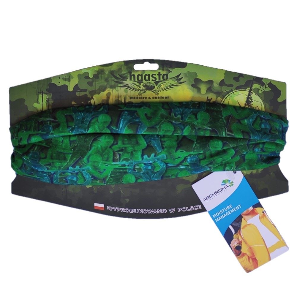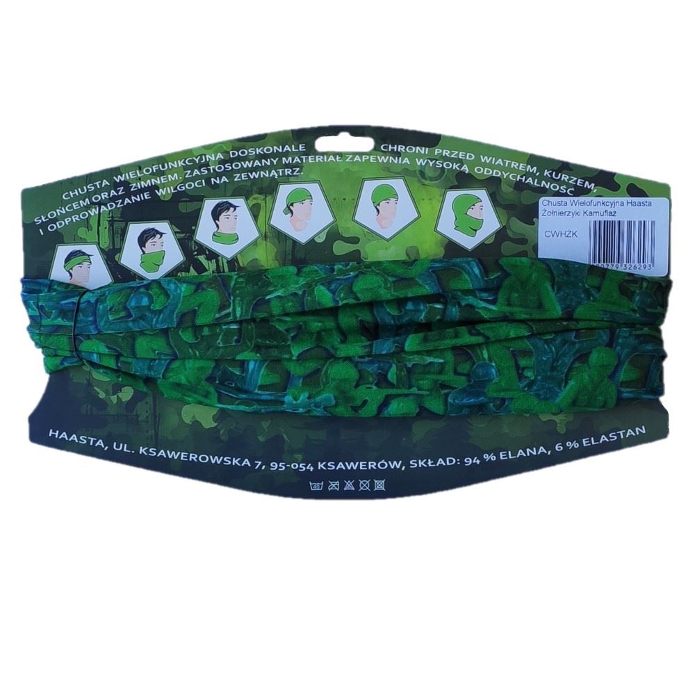 Nasza chusta wielofunkcyjna wzór Żołnierzyki jest zarówno ciekawym pomysłem na urozmaicenie stroju oraz modnym dodatkiem. Chusta wielofunkcyjna Haasta to wszechstronny produkt. Chusta jest doskonała do stosowana na wiele sposobów w użytku codziennym. W bardzo łatwy sposób z chusty można zrobić czapkę, maskę, opaskę czy kominiarkę. Może służyć także jako szalik czy ozdobna apaszka lub jako maseczka ochronna na twarz.