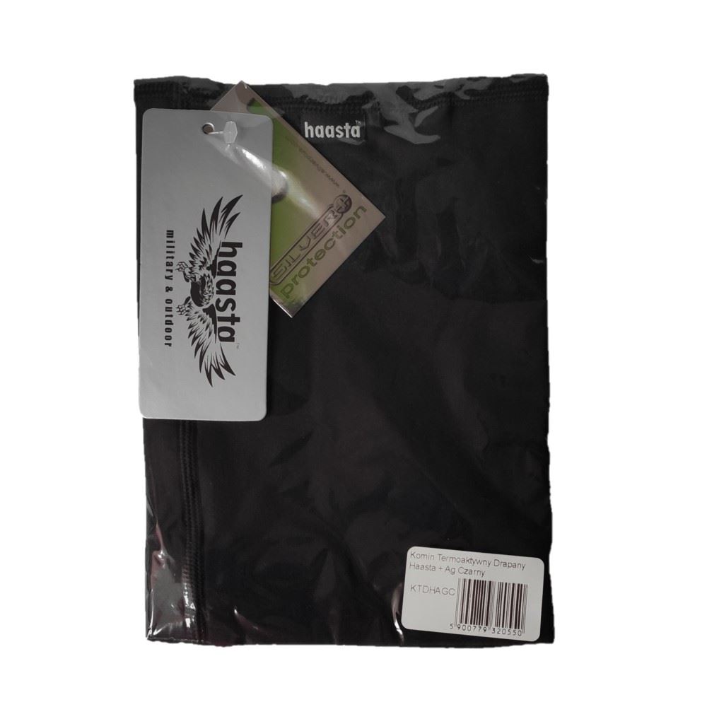 Komin termoaktywny Haasta drapany w kolorze czarny jest gładki na zewnątrz a od spodu wykończony przyjemnym meszkiem (dzianina drapana). Dodatkowo tkanina wzbogacona jonami srebra zwiększa ochronę antybakteryjną.