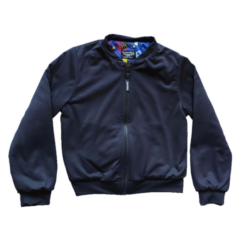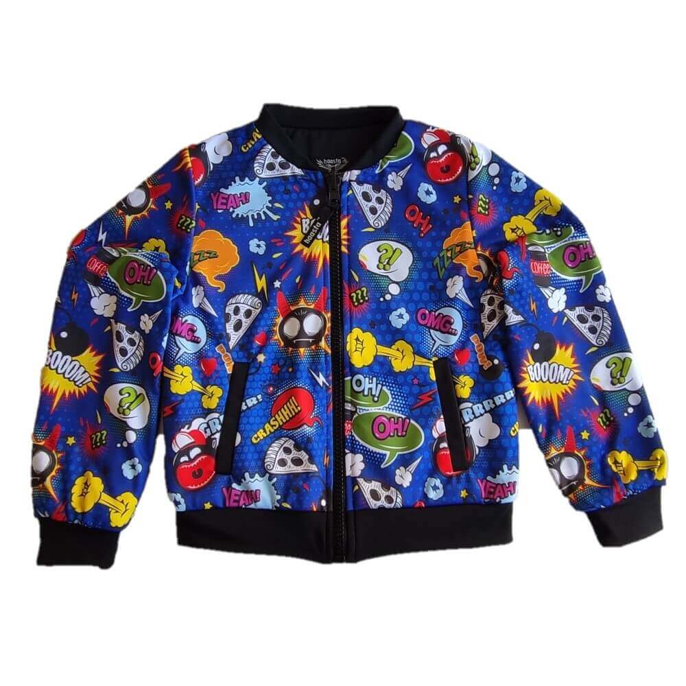 Prezentowana kurtka jest dwustronna co oznacza że jedna strona to kolorowy komiksowy nadruk z czarnymi ściągaczami, natomiast druga jest w całości czarna. Zastosowane rozwiązanie kurtki dwustronnej daje nam możliwość szybkiej zmiany wyglądu przez co mamy błyskawiczną możliwość zmiany stroju od ręki.