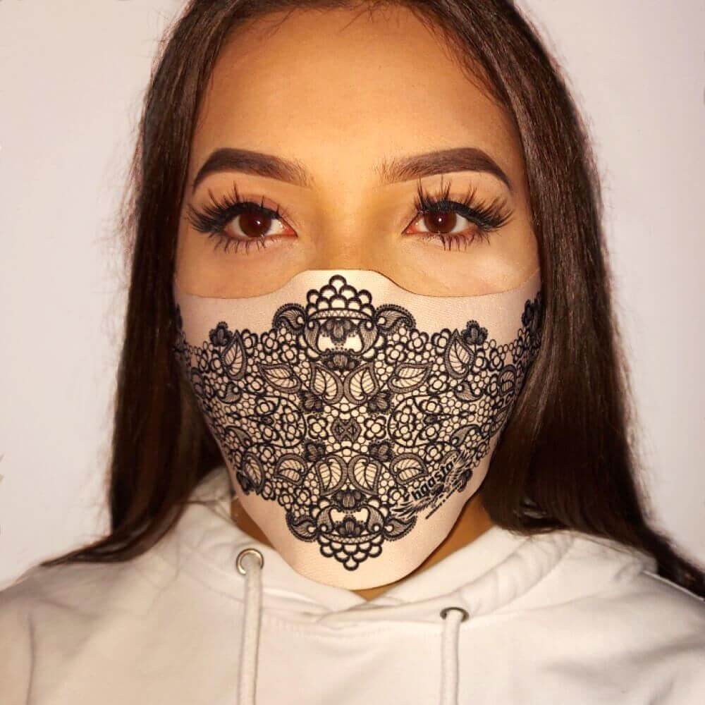 Maseczka ochronna młodzieżowa/damska wzór Koronka Wenecka, wyprodukowana w całości w Polsce. Materiał używany w produkcji jest także stosowany do wyrobu odzieży termoaktywnej. Dzięki czemu maseczki posiadają te same właściwości. Dodatkowo tkaninę pokrywa apertura jonami srebra.