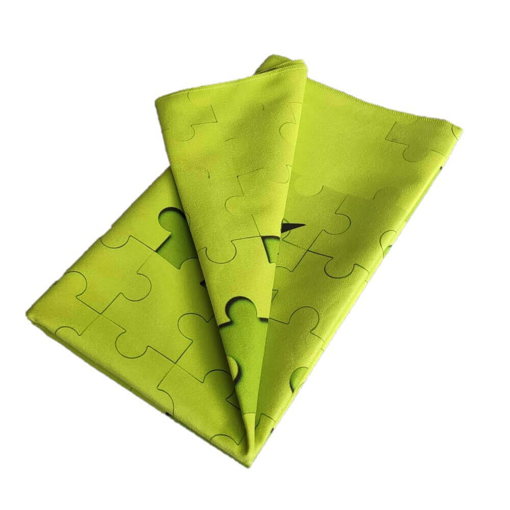 Całość jest wykonana na bazie mikrofibry w kolorze zielonym z cyfrowym nadrukiem po jednej stronie w kształcie puzzla. Szybkoschnący ręcznik w  został wykonany z dzianiny Mikrofibra składającej się z odpowiedniej mieszanki bardzo cienkich włókien poliestrowych i poliamidowych (nylon).   Dzięki temu ręcznik jest pięciokrotnie lżejszy od klasycznych ręczników, a jednocześnie potrafi przyjąć pięciokrotnie więcej wilgoci niż sam waży. Idealny dla ludzi aktywnych.  Ręcznik pakowany w worek siatkowy ściągany stoperem.